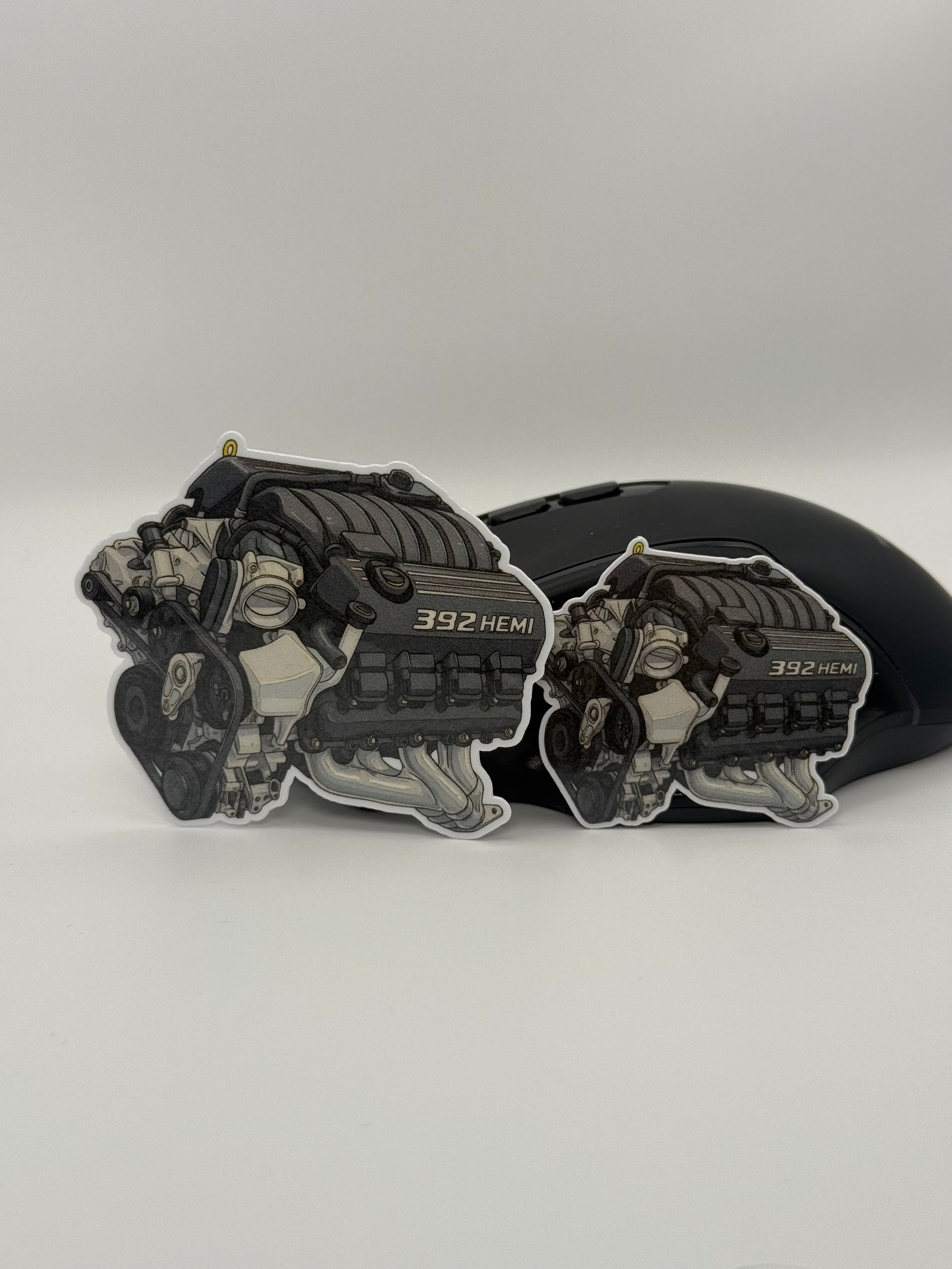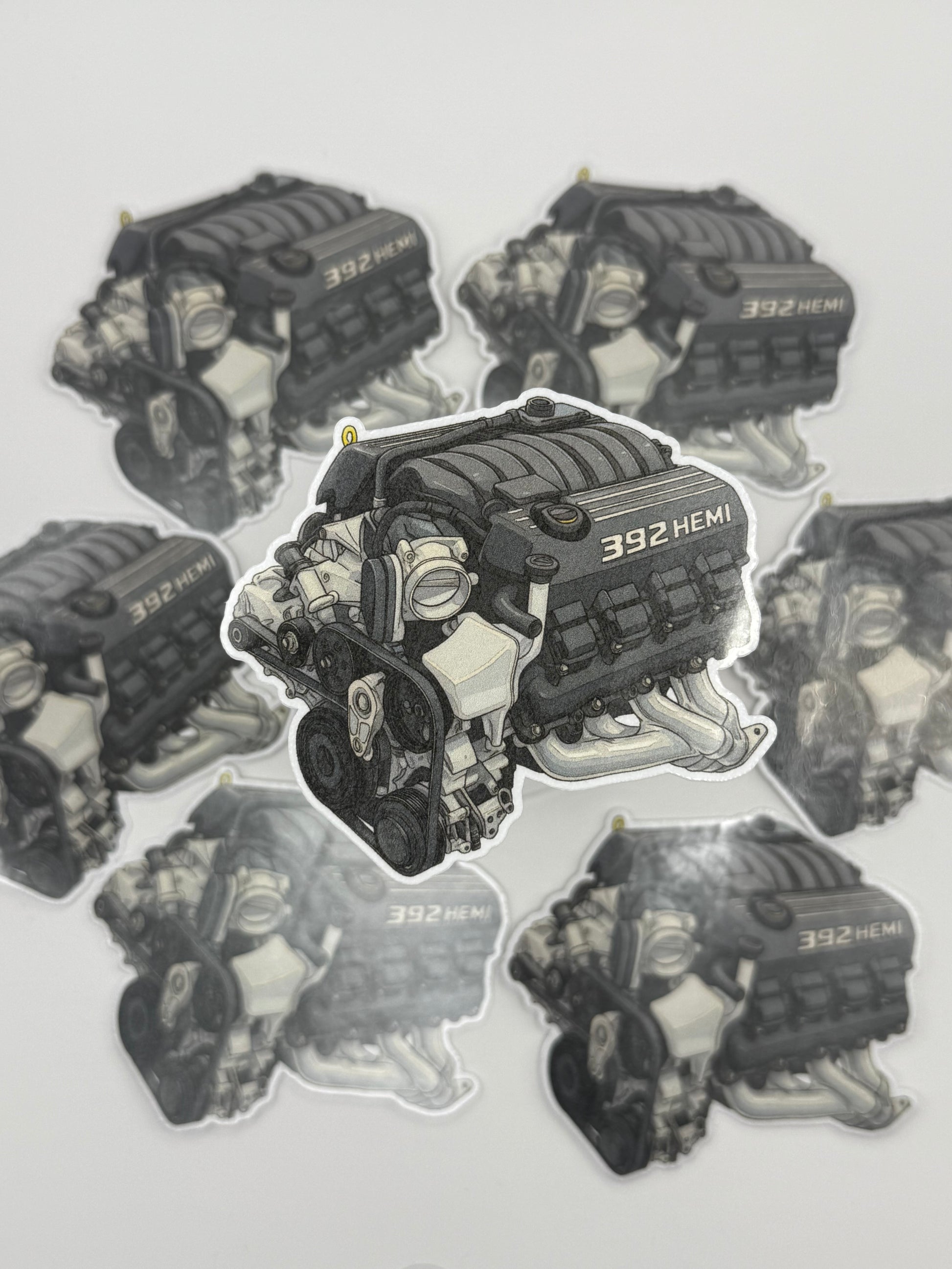 The sweet spot of the Mopar lineup. This high-detail sticker features the 6.4L "392" HEMI V8, the naturally aspirated beast found in the Charger/Challenger Scat Packs and SRT models. The illustration clearly shows the active intake manifold and the signature "392 HEMI" lettering on the valve covers.