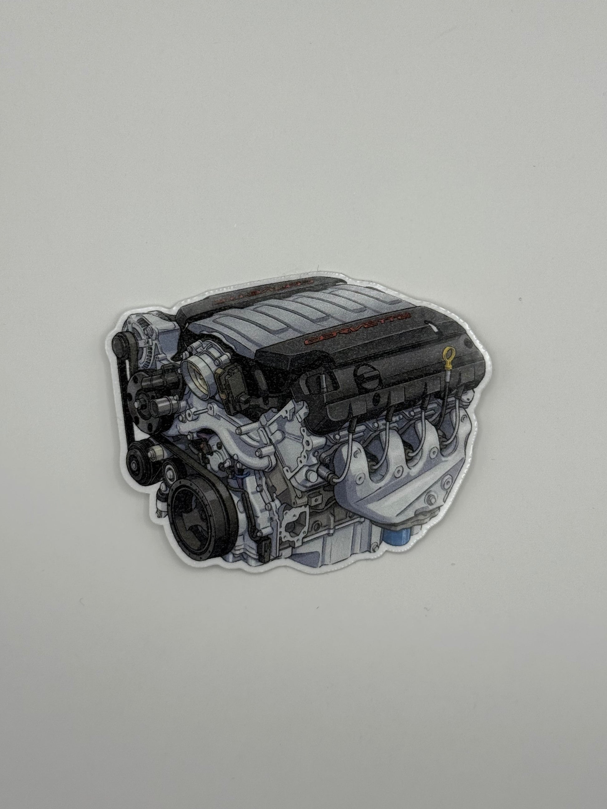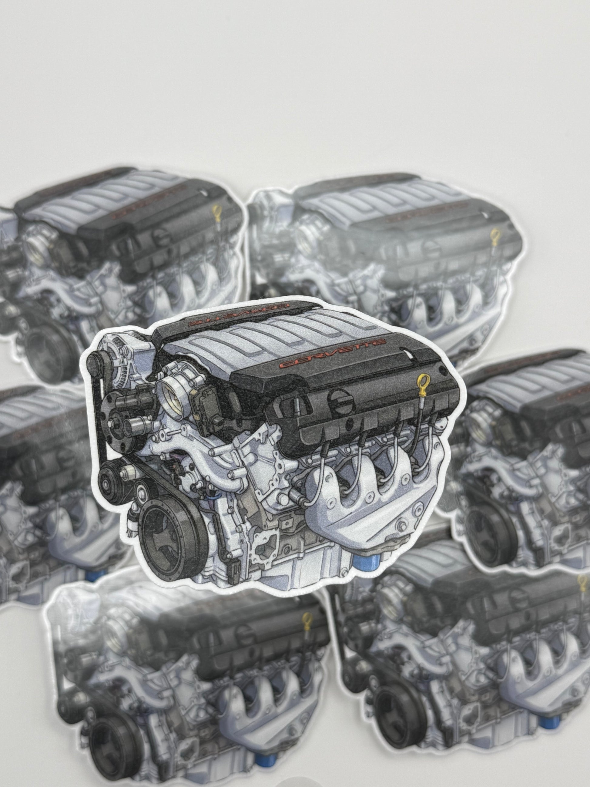 The heart of the C7 Stingray. This detailed sticker features the Gen V LT1 6.2L V8 as seen in the 2014-2019 Corvette. It captures the modern direct-injection look with the signature "Corvette" script on the composite intake covers and the complex accessory drive system