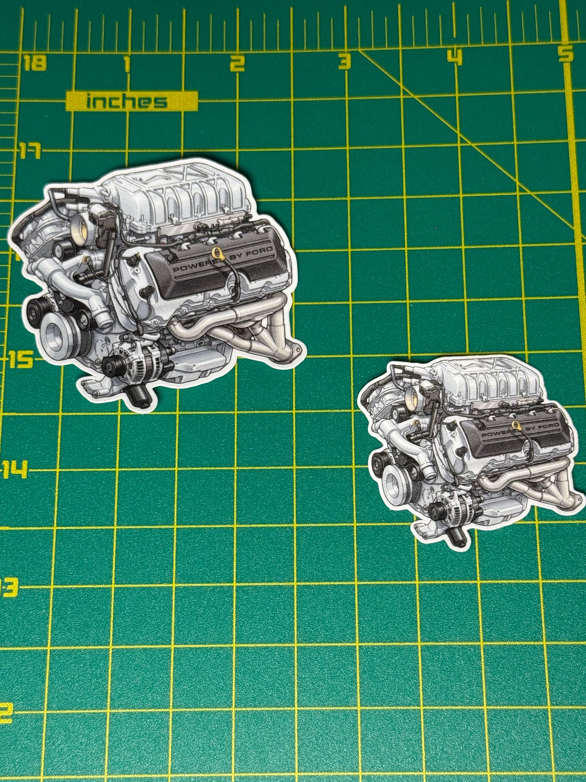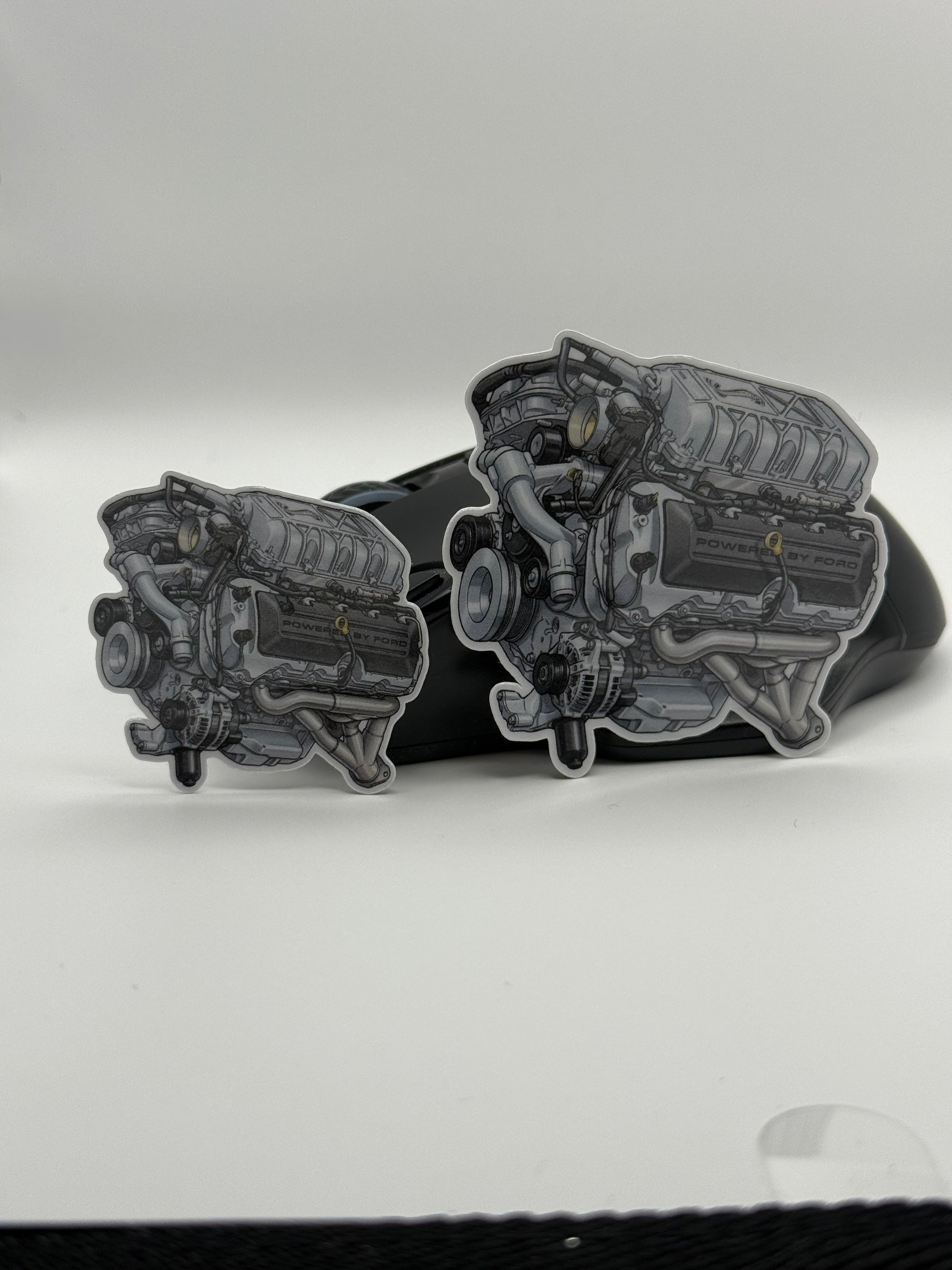 Celebrate the pinnacle of American muscle with this highly detailed illustration of the 5.2L "Predator" V8 found in the Shelby GT500. This isn't just a generic engine sticker; it features the correct "Powered By Ford" cam covers, the massive Eaton supercharger housing, and the signature exhaust headers.