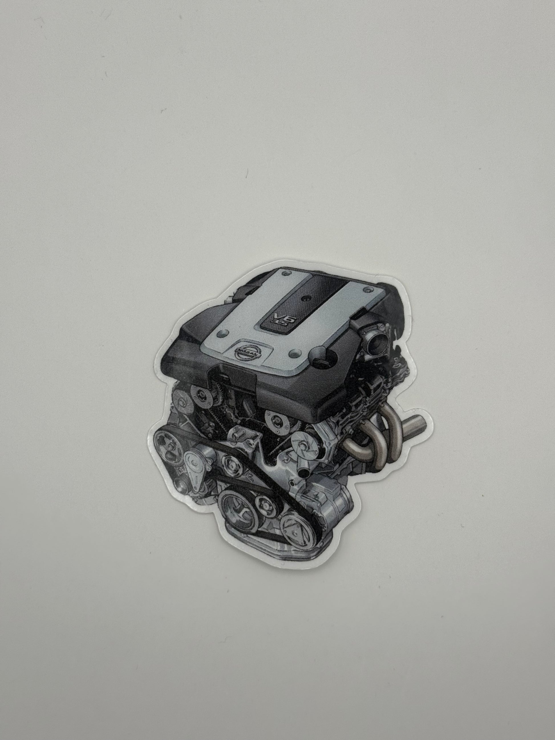 Rep the V6 that redefined the import scene. This detailed sticker features the Nissan VQ35DE, the 3.5L workhorse found in the 2003-2006 350Z and Infiniti G35. The illustration accurately captures the "DE" spec single-throttle plenum, the signature silver engine cover, and the accessory belt layout.