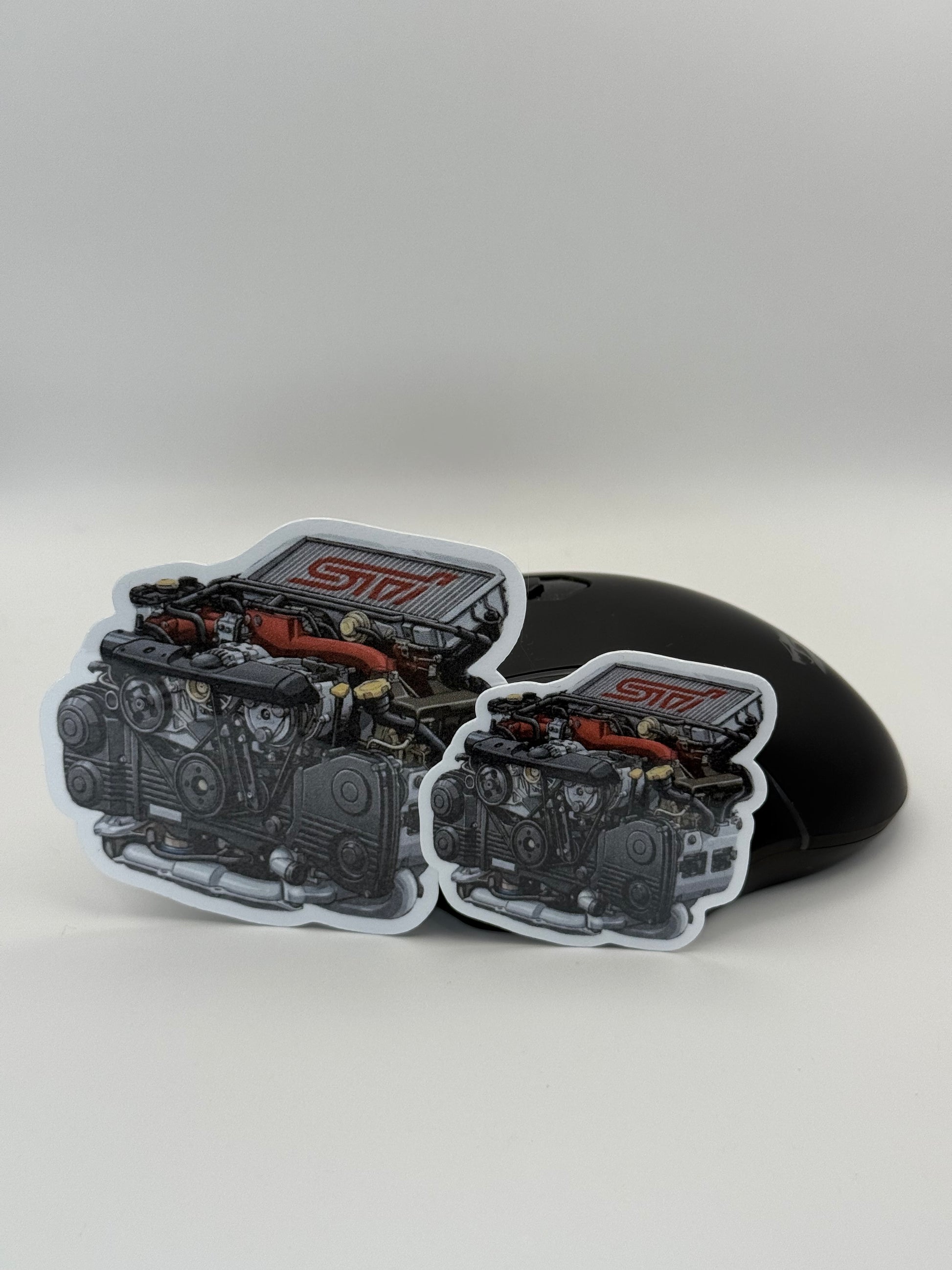 Rep the engine that defined the AWD sport compact scene. This high-detail sticker features the legendary Subaru EJ20/EJ25 Boxer engine found in the WRX STI. The illustration captures the signature "Red Top" wrinkle-finish intake manifold, the prominent timing belt covers, and the massive STI Top-Mount Intercooler (TMIC).